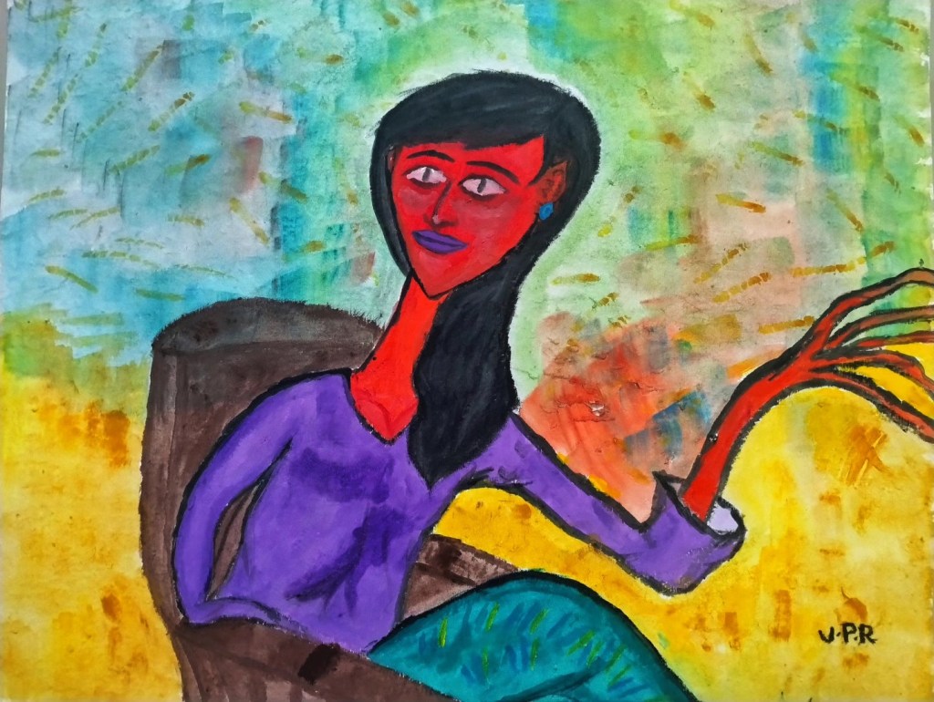 Title: Woman on a brown chair
